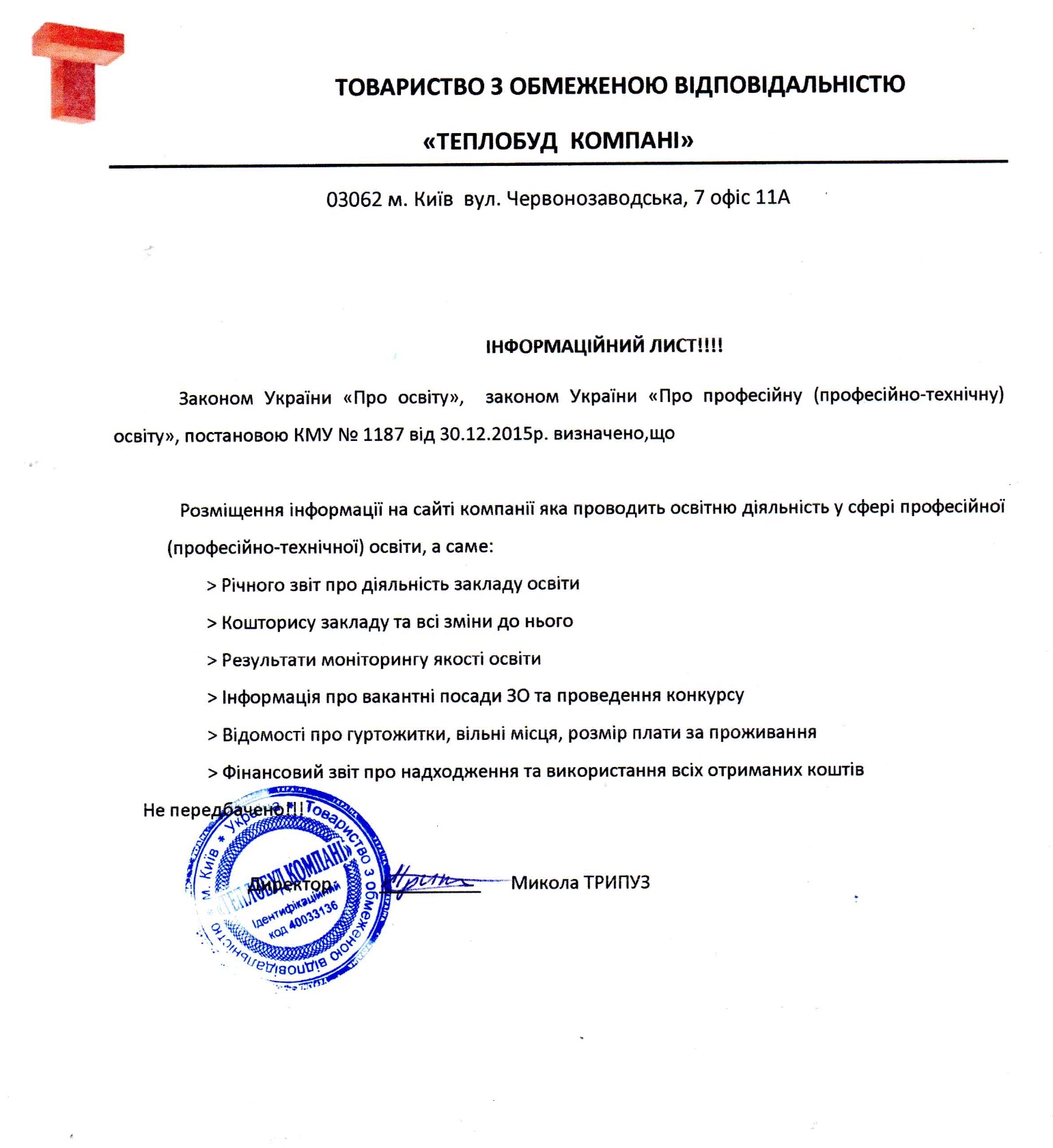 ВИТЯГ з ПОЛОЖЕННЯпро структурний підрозділ професійної (професійно-технічної) освітиТовариства з обмеженою відповідальністю «ТЕПЛОБУД КОМПАНІ»від 13.12.2021 рокуСтруктурний підрозділ професійної (професійно-технічної) освіти Товариства з обмеженою відповідальністю «ТЕПЛОБУД КОМПАНІ», до повноважень якого належить освітня діяльність у сфері професійної (професійно-технічної) освіти, створений наказом Товариства з обмеженою відповідальністю «ТЕПЛОБУД КОМПАНІ» від 01 червня 2021року № 3 та діє на підставі законів України «Про освіту», «Про професійну (професійно-технічну) освіту», інших, що регулюють діяльність у сфері освіти, Статуту Товариства з обмеженою відповідальністю «ТЕПЛОБУД КОМПАНІ» та чинного Положення про структурний підрозділ професійної (професійно-технічної) освіти Товариства з обмеженою відповідальністю «ТЕПЛОБУД КОМПАНІ» (далі - Положення), розробленого згідно з нормативно-правовими актами у сфері професійної (професійно-технічної) освіти.Структурний підрозділ П(ПТ)О входить у склад Товариства та підпорядковується безпосередньо директору.